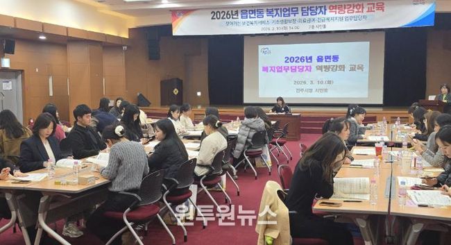 (원투원뉴스) 진주시는 10일 시청 시민홀에서 읍면동의 복지 업무 담당자 50여 명을 대상으로 ‘복지정책 이해와 실무능력 향상을 위한 역량 강화 교육’을 실시했다고 밝혔다.