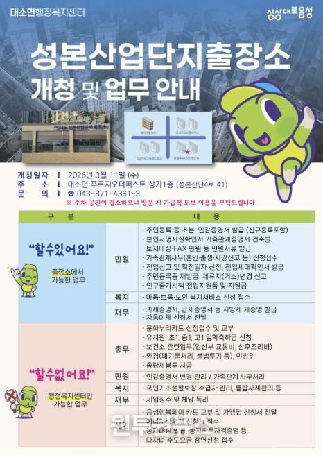 아울러 군은 향후 성본산단 인구 증가와 행정 수요 확대에 대비해 신축 출장소 건립도 중장기적으로 추진할 계획이다.