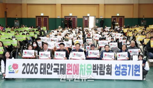 (원투원뉴스) 태안군이 범군민지원협의회와 함께 ‘2026년 태안국제원예치유박람회’의 성공적인 개최를 위해 지역 주민들의 자발적인 참여를 이끌어내는 대규모 범군민 다짐대회를 개최하며 민관 협력 기반의 강력한 흥행몰이에 나선다.