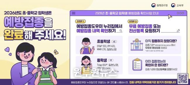 초등학교 입학생은 △DTaP 5차 △폴리오 4차 △MMR 2차 △일본뇌염 등 4종의 접종 완료 여부를 확인해야 하며, 중학교 입학생은 △Tdap(또는 Td) 6차 △일본뇌염 △HPV 1차(여학생) 등 3종의 접종 여부를 확인해야 한다.