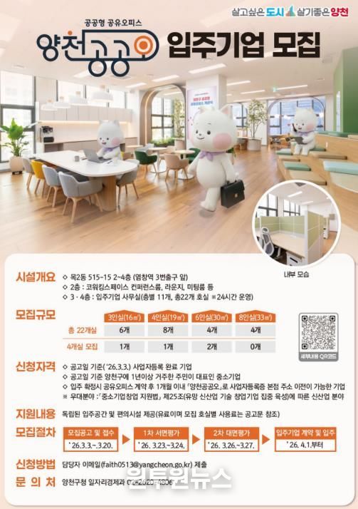 (원투원뉴스) 양천구는 지역 내 유망한 창업기업의 안정적인 성장을 지원하기 위해 ‘양천 공공형 공유오피스(이하 양천공공오)’의 잔여 공실에 입주할 기업을 오는 20일까지 공개 모집한다고 11일 밝혔다.