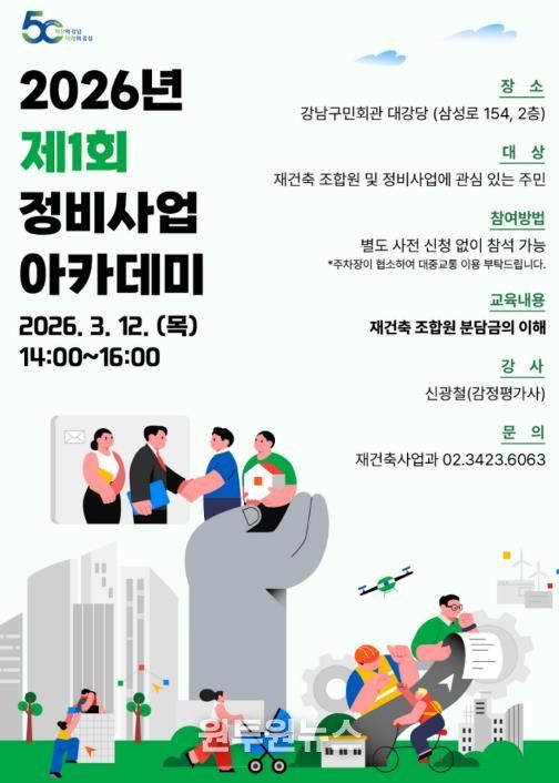 (원투원뉴스) 꿈이 모이는 도시, 미래를 그리는 강남구가 오는 3월 12일 오후 2시부터 4시까지 강남구민회관 2층 대강당에서 ‘2026년 제1회 정비사업 아카데미’를 개최한다.