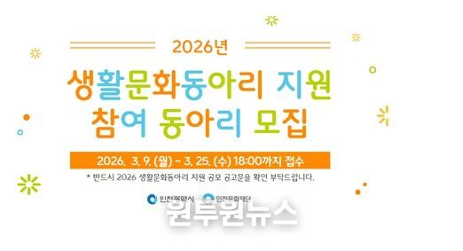 (원투원뉴스) 인천광역시와 인천문화재단은 인천 시민들의 자발적인 문화예술 활동을 지원하기 위해 '2026 생활문화동아리 지원' 사업을 추진한다.