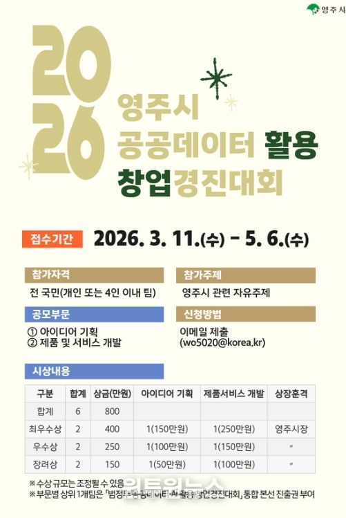 (원투원뉴스) 영주시는 공공데이터 기반 창업을 촉진하기 위해 3월 11일부터 5월 6일까지 ‘2026년 영주시 공공데이터 활용 창업경진대회’ 참가자를 모집한다.
