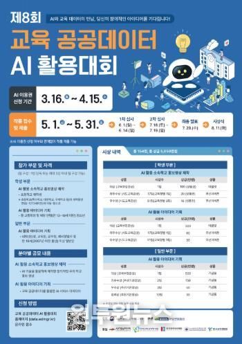 (원투원뉴스) 부산광역시교육청은 교육 공공데이터와 인공지능(AI)을 결합한 창의적 아이디어를 발굴하기 위한 ‘제8회 교육 공공데이터 AI활용대회’를 개최한다고 밝혔다.