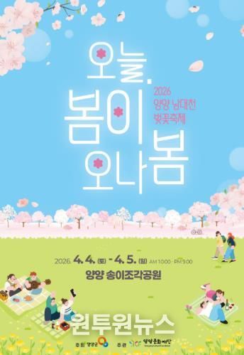 양양군과 양양문화재단은 오는 4월 4일부터 5일까지 이틀간 남대천 송이조각공원 및 인접 도로 일원에서 ‘2026 양양 남대천 벚꽃축제’를 개최한다고 밝혔다.