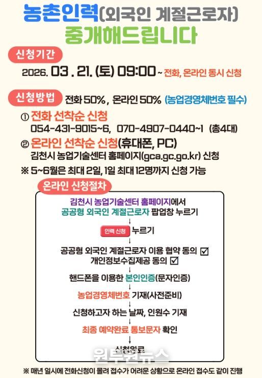 (원투원뉴스) 김천시가 농번기 인력난 해소를 위해 오는 3월 21일 오전 9시부터 ‘2026년 공공형 외국인 계절근로자’ 신청을 받는다고 밝혔다.
