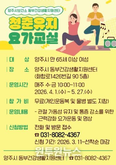 ‘청춘유지 요가교실’은 만 65세 이상 양주시 여성을 대상으로 하며, 참여 신청은 3월 11일부터 전화 또는 방문을 통해 접수할 수 있다.
