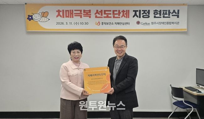 (원투원뉴스) 청주시 흥덕보건소 치매안심센터는 11일 청주시장애인종합복지관에서 치매극복선도단체 지정 현판식을 개최했다.