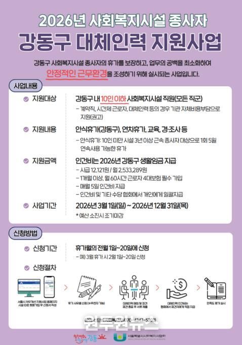 (원투원뉴스) 서울 강동구는 소규모 사회복지시설의 업무 공백을 줄이고 종사자의 휴식권을 보장하기 위해 ‘사회복지시설 종사자 대체인력 지원사업’을 추진한다고 밝혔다.