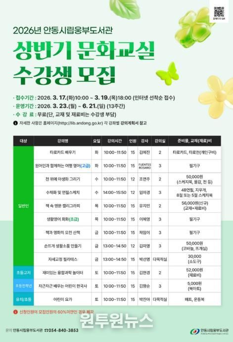 (원투원뉴스) 안동시립웅부도서관이 오는 3월 17일부터 3월 19일까지 2026년 상반기 문화교실 수강생을 모집한다.