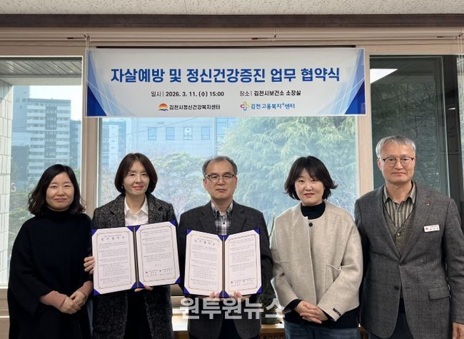 (원투원뉴스) 김천시정신건강복지센터와 김천고용복지플러스센터는 11일 구직자의 정신건강 증진과 자살 예방을 위한 협력체계 구축을 위해 업무협약을 체결했다.