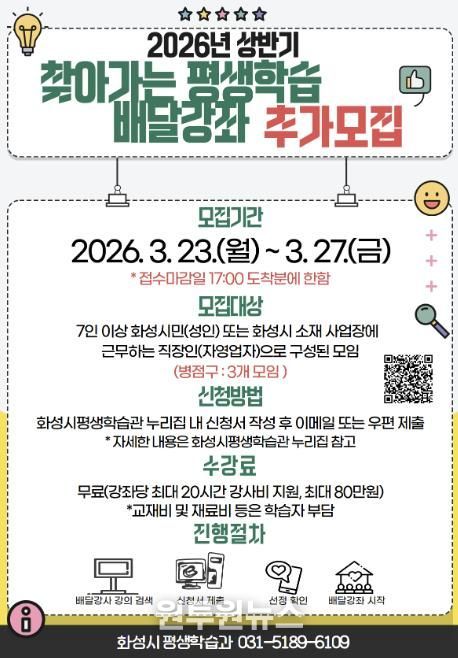 (원투원뉴스) 화성특례시는 시민의 다양한 학습 수요를 반영한 맞춤형 평생학습 프로그램 운영을 위해 ‘2026년 상반기 찾아가는 평생학습 배달강좌’를 추가 모집한다고 밝혔다.