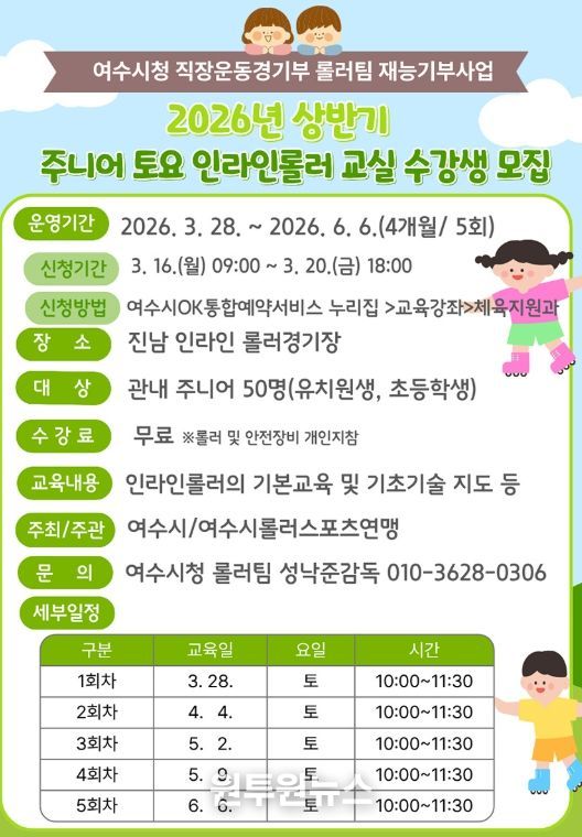 (원투원뉴스) 여수시가 지역 유소년을 대상으로 ‘2026년 상반기 주니어 토요 인라인롤러 교실’을 운영하고 오는 3월 16일부터 20일까지 수강생을 선착순 모집한다.