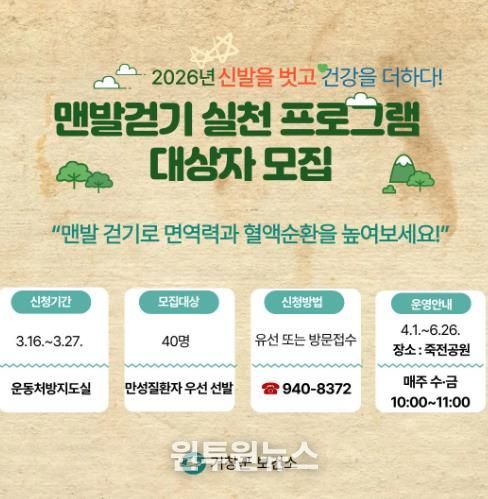 이정헌 보건소장은 “맨발걷기는 발바닥 자극을 통해 혈액순환 개선과 스트레스 완화 등 건강 증진에 도움을 줄 수 있는 생활 속 신체활동”이라며 “주민들이 자연 속에서 맨발로 걷는 즐거움을 느끼는 기회가 되길 바란다”고 말했다.