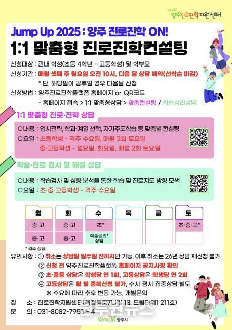한편, 양주시 진로진학지원센터는 1대1 상담 외에도 면접 컨설팅, 진학 설명회 등 다양한 맞춤형 프로그램을 지속적으로 선보일 예정이다.