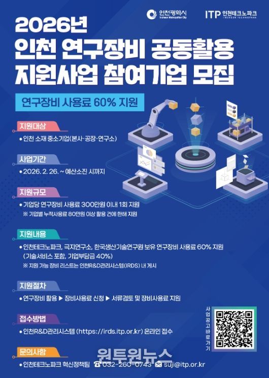 (원투원뉴스) 인천테크노파크(인천TP)는 인천 지역 중소기업의 연구개발(R·D) 역량을 높이고 장비 사용료 부담을 줄여주기 위해, ‘2026년 인천 연구장비 공동활용 지원사업’ 참여기업을 모집한다고 밝혔다.