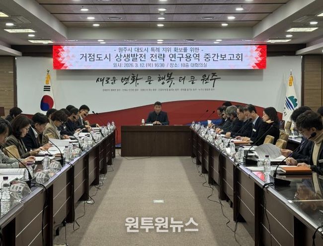 (원투원뉴스) 원주시는 지난 12일 시청 10층 대회의실에서 대도시 특례 지위 확보를 위한 ‘거점도시 상생발전 전략 연구용역’ 중간보고회를 개최했다.