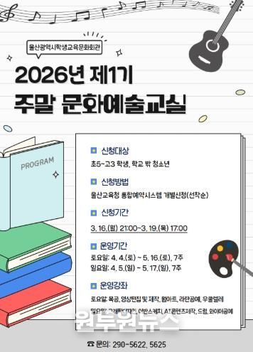 (원투원뉴스) 울산학생교육문화회관은 오는 4월 4일부터 5월 17일까지 울산 지역 초등학교 5학년부터 고등학교 3학년 학생을 대상으로 ‘2026년 제1기 주말 문화예술 교실’을 운영한다.
