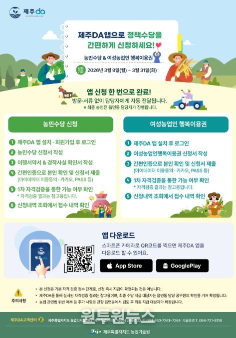 농민수당 및 여성농업인 행복이용권 지원사업 신청기간은 3월 31일까지이며, 제주DA 앱을 통한 비대면 신청 서비스는 3월 9일 시범 운영을 시작해 공공 마이데이터 서비스 승인 절차를 거쳐 3월 16일부터 정식 운영할 예정이다.