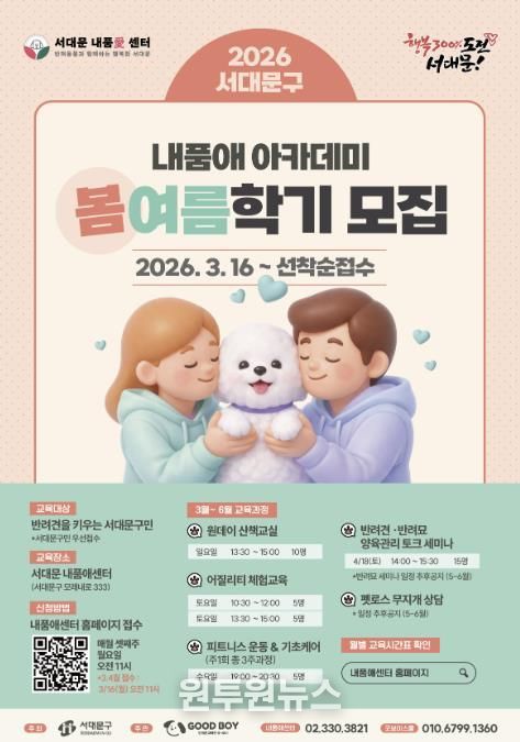 (원투원뉴스) 서대문구가 이달부터 올 12월까지 관내 반려인과 주민을 위한 반려문화 교육 프로그램 '2026 내품애아카데미’를 서대문 내품애(愛)센터(모래내로 333)에서 운영한다고 13일 밝혔다.