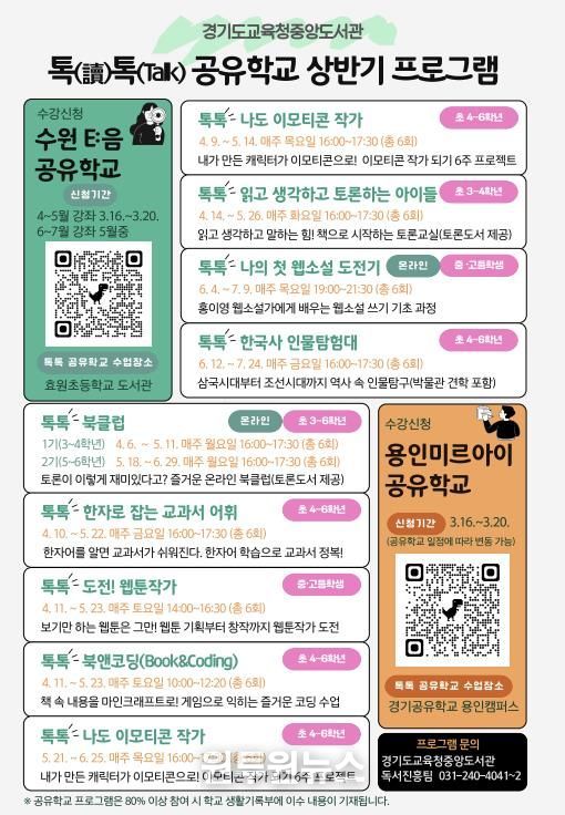 (원투원뉴스) 경기도교육청중앙도서관이 학생들의 창의적 사고력과 진로설계 역량을 강화하기 위해 4월부터 7월까지 녪년 상반기 톡(讀)톡(talk) 공유학교’를 운영한다.