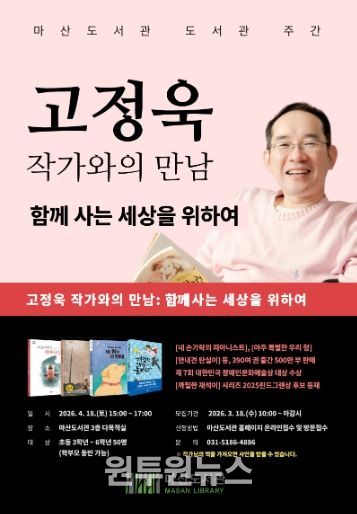 (원투원뉴스) 김포시 마산도서관은 도서관 주간(4월 12일~18일)을 맞아 오는 4월 18일 오후 3시 ‘고정욱 작가와의 만남: 함께 사는 세상을 위하여’를 개최한다고 밝혔다.