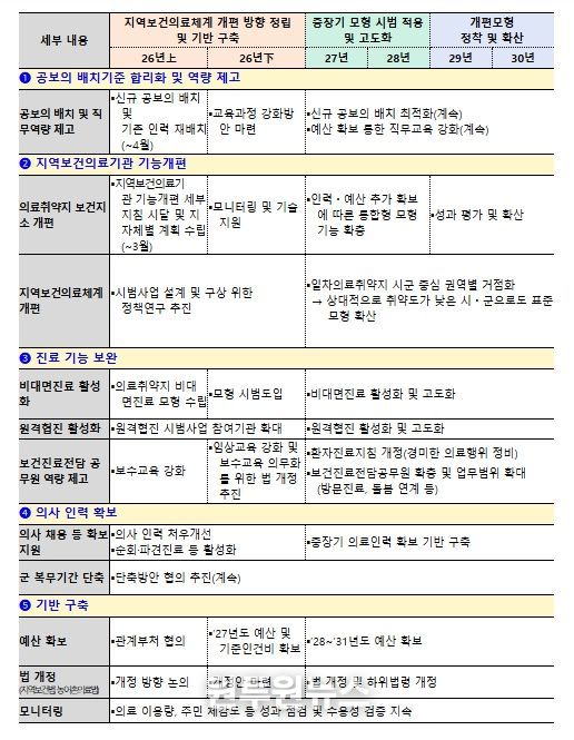 앞으로 수년간 공보의 부족 상황이 지속될 것으로 예상되는 만큼, 지역보건의료체계 개편도 추진할 계획이다. 지역에 투자하는 혁신사업을 통해 취약지의 의료인력 확보와 연계망(네트워크) 구축을 집중 지원하고, 의료자원의 집중화·거점화와 함께 찾아가는 진료·돌봄서비스를 강화하여 지역 중심의 완결적 일차의료 체계를 만들어 나갈 계획이다. 이를 통해 지역의사제를 통해 신규로 양성된 의사 인력이 지역보건의료기관에 효율적으로 배치·근무할 수 있는 기반을 마련해나갈 예정이다.