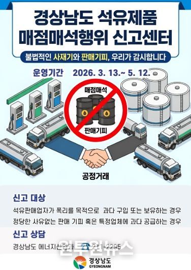 (원투원뉴스) 경상남도는 ‘석유류 최고가격 고시’ 시행에 따라 고유가 시세 차익을 노린 매점매석 행위를 차단하기 위해 3월 13일부터 5월 12일까지 도청 에너지산업과 내에 ‘석유제품 매점매석 신고센터’를 운영한다고 밝혔다.