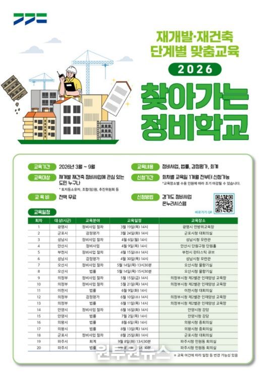 (원투원뉴스) 경기도는 오는 3월 19일 광명시를 시작으로 9월까지 재개발·재건축 조합 등을 대상으로 한 현장 맞춤형 교육 프로그램 ‘2026 찾아가는 정비학교’를 운영한다.