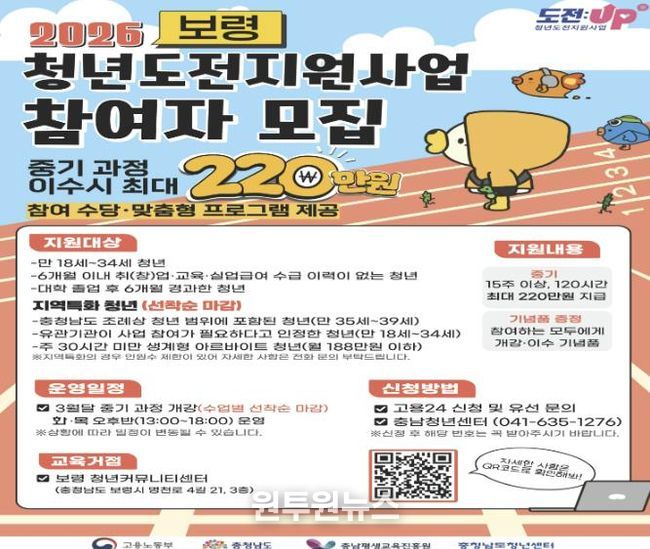 (원투원뉴스) 보령시는 충남청년센터와 협력해 구직에 어려움을 겪는 지역 청년들을 대상으로 ‘청년도전 지원사업’ 참여자를 모집한다고 밝혔다.