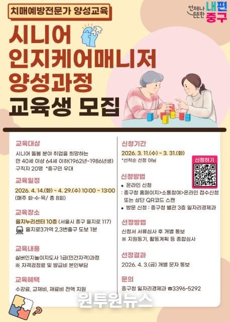 (원투원뉴스) 서울 중구가 치매예방 전문인력을 늘려 돌봄서비스 향상을 도모하고 중장년층 대상의 새로운 일자리를 창출하기 위해 올해부터 '시니어 인지케어매니저 양성과정'을 신설한다.