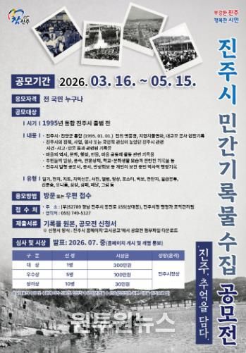 (원투원뉴스) 진주시는 사라져가는 지역의 옛 모습과 시민들의 소중한 생활사를 체계적인 기록 자산으로 보존하기 위해 ‘진주시 민간 기록물 수집 공모전: 진주, 추억을 담다’를 개최한다고 밝혔다.