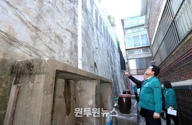 박 구청장은 13일, 사당4동과 상도1동을 방문해 노후 석축·옹벽과 노후 축대·경사면 등의 손상 여부와 안전 상태를 점검했다.