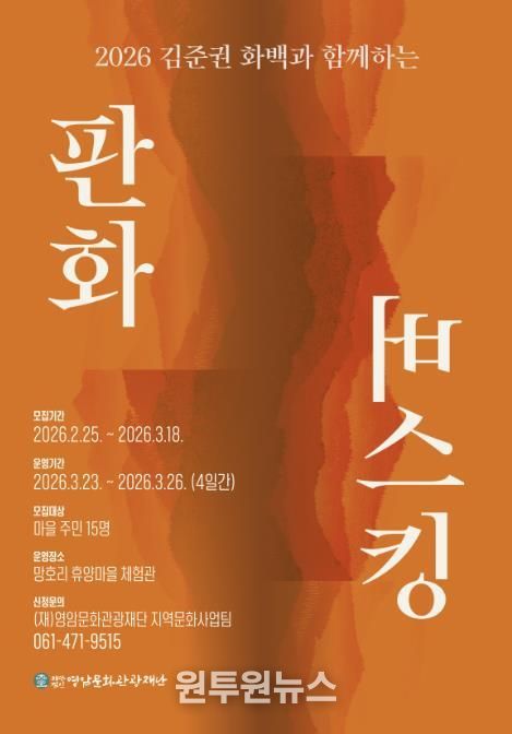 (원투원뉴스) (재)영암문화관광재단은 오는 3월 23일부터 26일 4일간, 마을주민 대상으로 한 ‘2026 김준권 화백과 함께하는 판화버스킹’프로그램 참여자를 모집한다.
