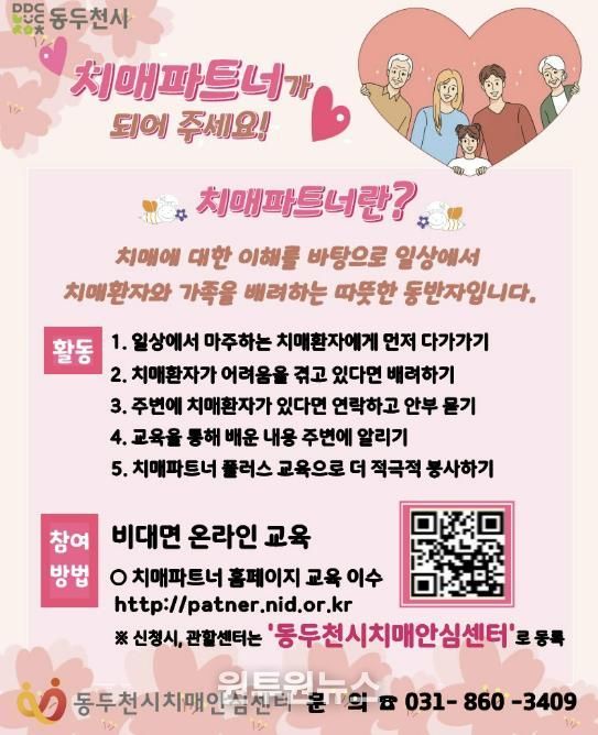 (원투원뉴스) 동두천시보건소 치매안심센터는 치매에 대한 부정적 인식을 개선하고 돌봄 문화 확산으로 치매 친화적 환경을 조성하기 위해 ‘치매파트너’ 양성 대상자를 상시 모집한다고 밝혔다