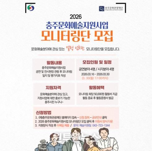 (원투원뉴스) (재)충주문화관광재단은 오는 30일까지 시민과 함께하는 소통 문화 확산을 위해 ‘2026 충주문화예술지원사업 시민 모니터링단’을 공개 모집한다고 밝혔다.