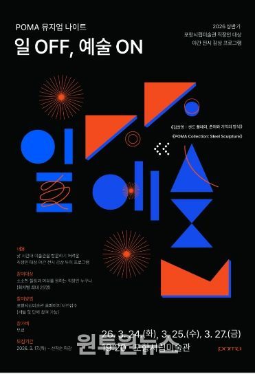 (원투원뉴스) 포항시립미술관은 오는 24일, 25일, 27일 사흘간 평일 낮 시간대 방문이 어려운 직장인들을 위해 야간 전시 감상 프로그램 ‘POMA 뮤지엄 나이트: 일 OFF, 예술 ON’을 운영한다.