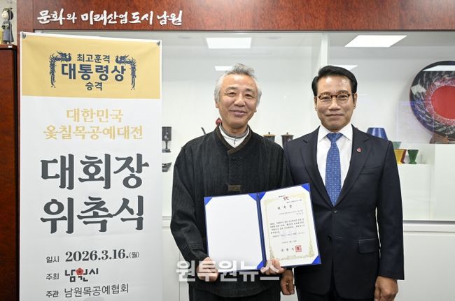 (원투원뉴스) 남원시가 주최하고 남원목공예협회가 주관하는 “대한민국 옻칠 목공예대전”의 운영사항을 총괄할 대회장에 국가무형유산 박종군 장도장이 재위촉됐다. 이번 재위촉에 따라 박종군 대회장은 2026년 3월 16일부터 2027년 10월 31일까지 제29회와 제30회 대전의 운영을 총괄하게 된다.
