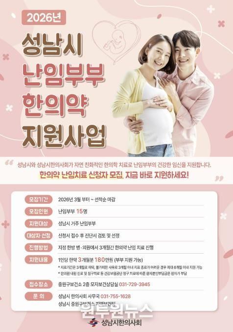 (원투원뉴스) 성남시는 난임부부를 위한 한의약 지원사업을 시행한다고 17일 밝혔다.