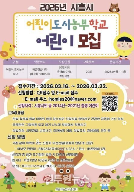 김익겸 시흥시농업기술센터 소장은 “어린이 도시농부학교를 통해 아이들이 자연과 농업의 가치를 직접 체험하고 건강한 먹거리에 대한 올바른 인식을 갖게 되길 기대한다”라며 “앞으로도 다양한 농업 체험 프로그램을 통해 지역사회와 함께하는 교육 활동을 확대해 나가겠다”라고 말했다.