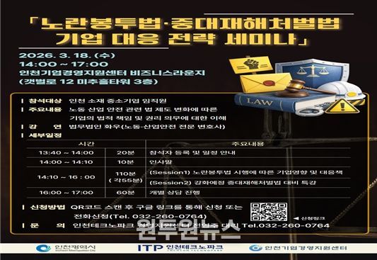 한편, 지원단의 첫 활동으로 오는 18일 인천테크노파크에서 '노란봉투법·중대재해처벌법 기업 대응 전략 세미나'가 개최될 예정이다.