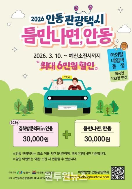 시는 ‘2026 경북 방문의 해’를 기념해 내·외국인 관광객 1팀당 3만 원의 요금 할인 혜택을 제공한다. 특히 3월 10일부터 예산 소진 시까지 진행되는 ‘틈만나면, 안동’ 캠페인 기간과 사계절 축제 기간에는 추가로 3만 원이 할인돼 이용객은 최대 6만 원까지 요금 할인을 받을 수 있다.