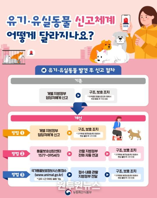 (원투원뉴스) 농림축산식품부는 3월 18일부터 동물보호상담센터 및 국가동물보호정보시스템을 통해 일반 국민들이 유실‧유기 동물을 발견하면 상시 신고할 수 있는 체계를 가동한다.