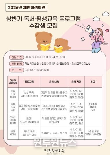 제천학생회관 홈페이지를 통해 프로그램 수강 신청이 가능하며, 접수는 3월 24일까지 진행된다.