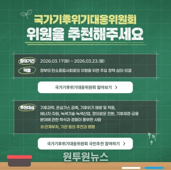 (원투원뉴스) 국가기후위기대응위원회(기후대응위)가 민간위원을 국민에게 직접 추천받는다.
