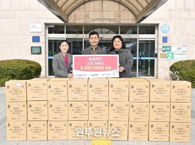 (원투원뉴스) 비비푸드가 3월 17일 오전 11시 중구청 구청장실을 찾아 울산사회복지공동모금회를 통해 이웃돕기 후원 물품으로 900만 원 상당의 배로 만든 간장 600병을 전달했다.