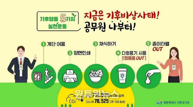 그간 창원특례시는 종이 없는 간부회의, 월 2~3회 구내식당 채식의 날 운영, 전국 최초 화장실 종이타월 사용 중단 등 다양한 실천 활동을 통해 기후위기 극복을 위해 힘써왔다.