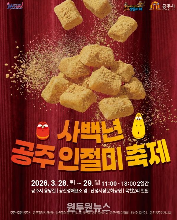 (원투원뉴스) 공주시는 오는 3월 28일부터 29일까지 이틀간 산성시장과 공산성 일원 등 왕도심에서 ‘2026년 사백년 공주 인절미축제’를 개최한다고 18일 밝혔다.