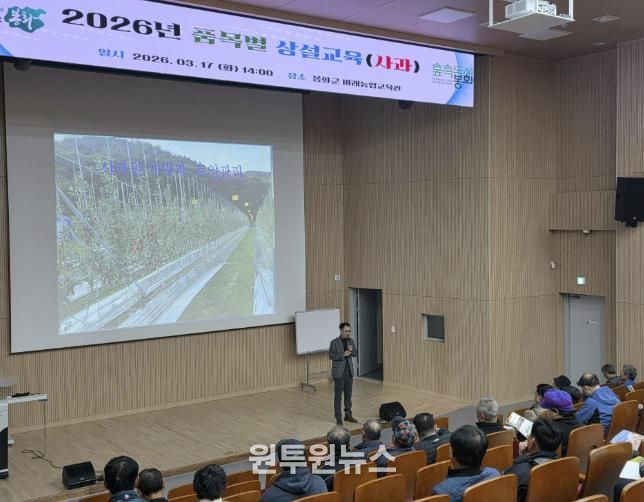 (원투원뉴스) 봉화군은 지역 주력 소득작목인 사과의 품질을 높이고 전문 농업인을 육성하기 위해 17일 농업기술센터 미래농업교육관에서 사과원 조성 및 재배기술 교육을 개최했다.